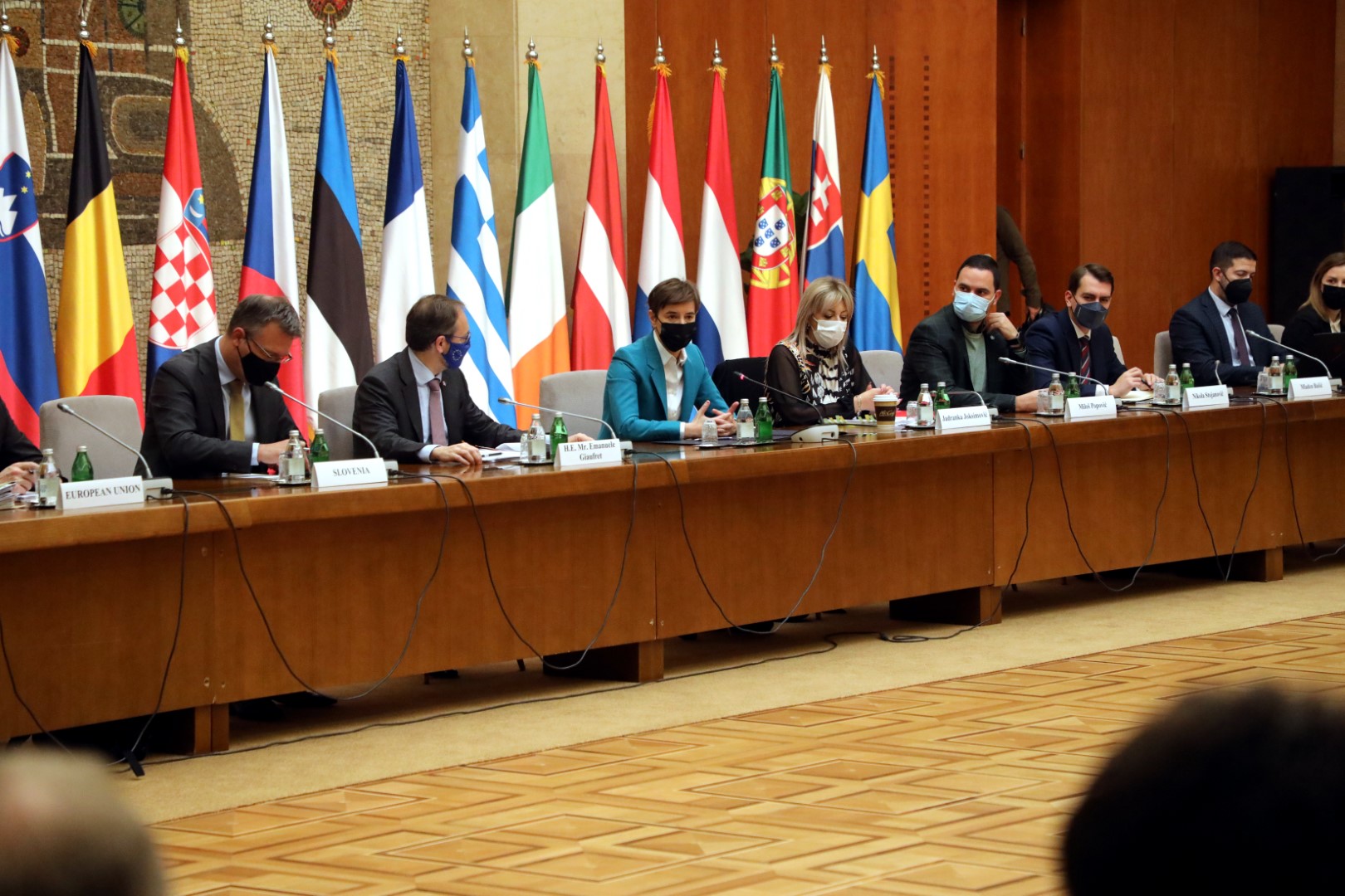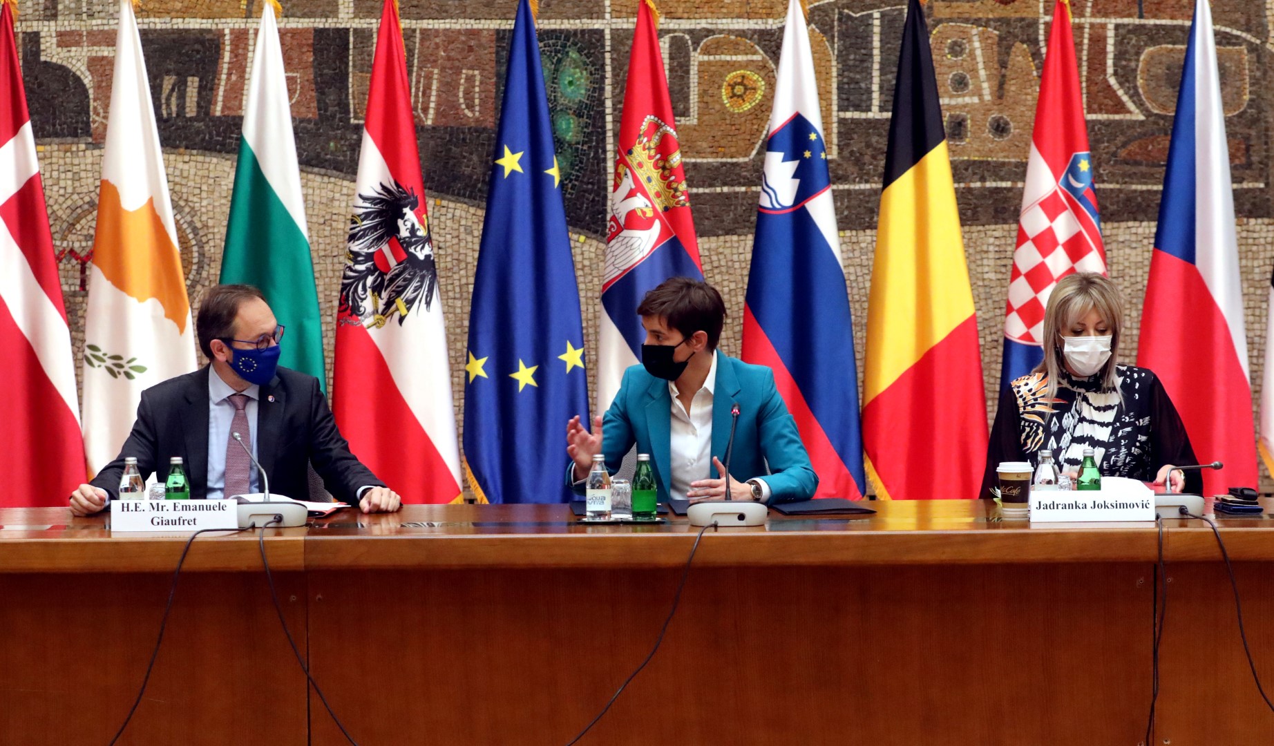 Председница Владе Републике Србије Ана Брнабић, заједно са министaрком за европске интеграције и главним преговарачем Јадранком Јоксимовић, састала се данас са шефом Делегације Европске уније у Србији Емануелеом Жиофреом и амбасадорима држава чланица ЕУ.