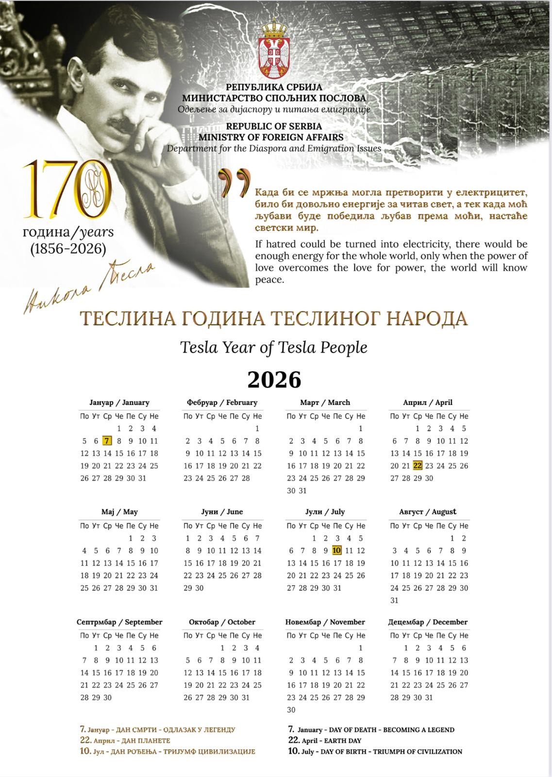 У години када обележавамо 170 година од рођења великог српског научника Николе Тесле, Одељење за дијаспору и питања емиграције Министарства спољних послова Републике Србије је израдило пригодан календар, са назначеним значајним датумима, за 2026. годину.